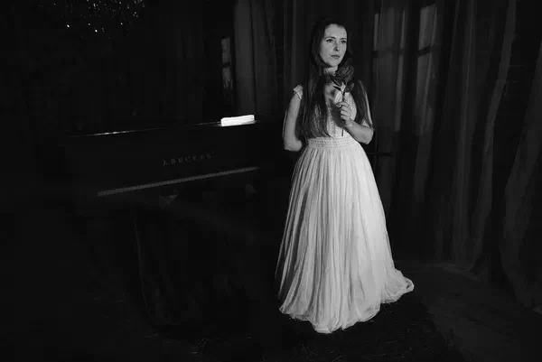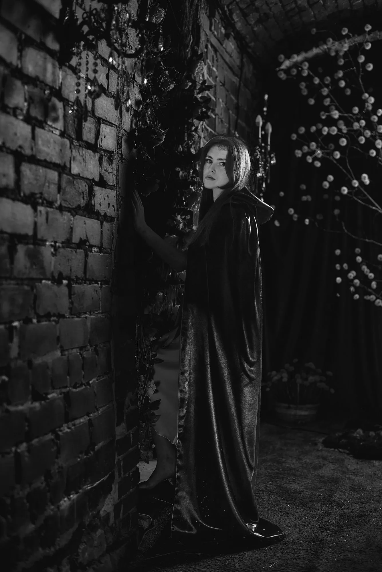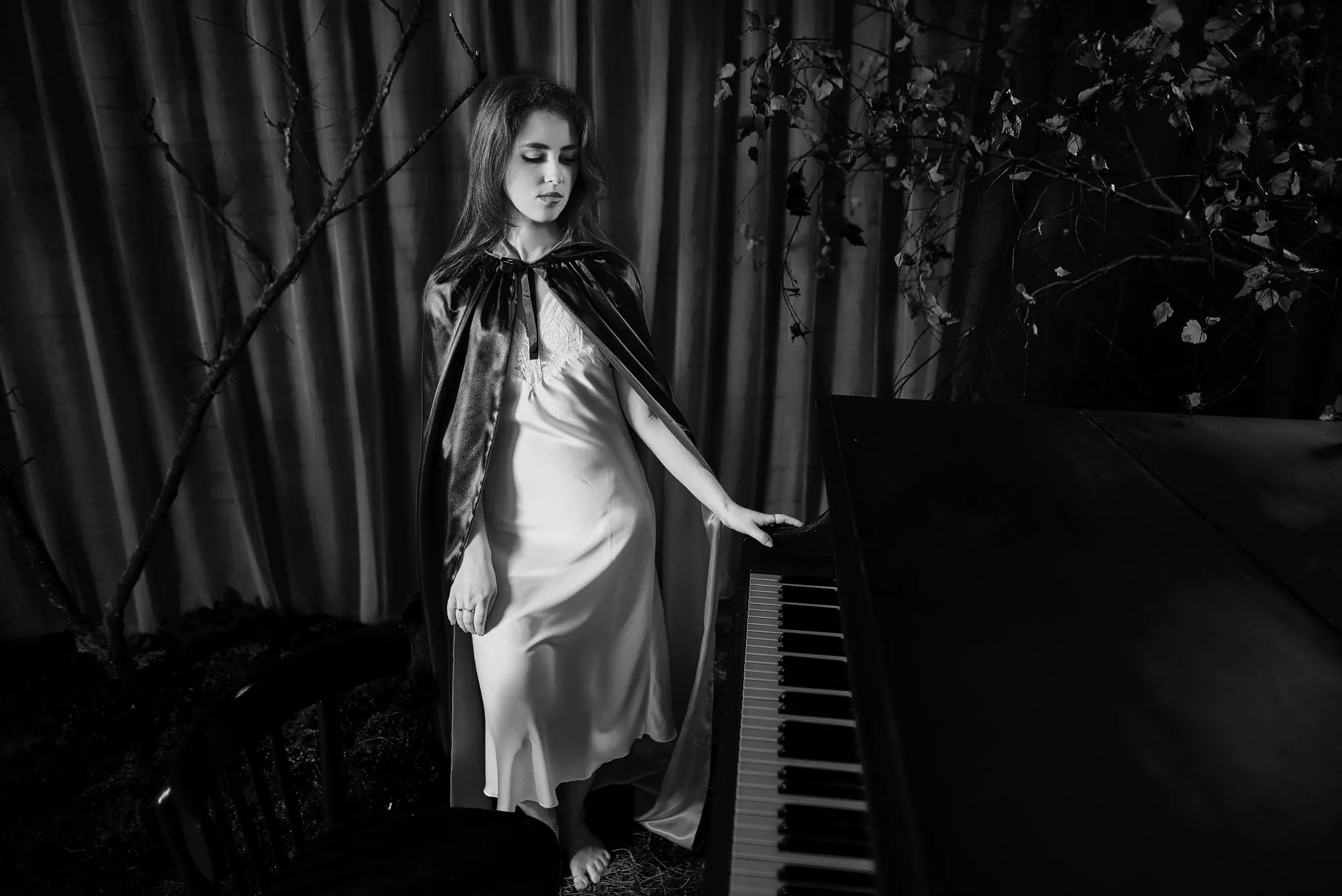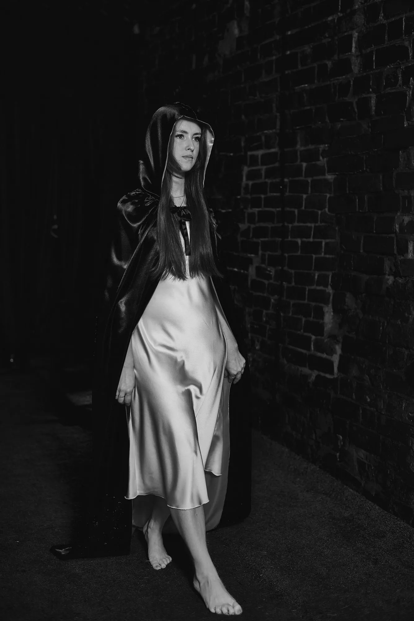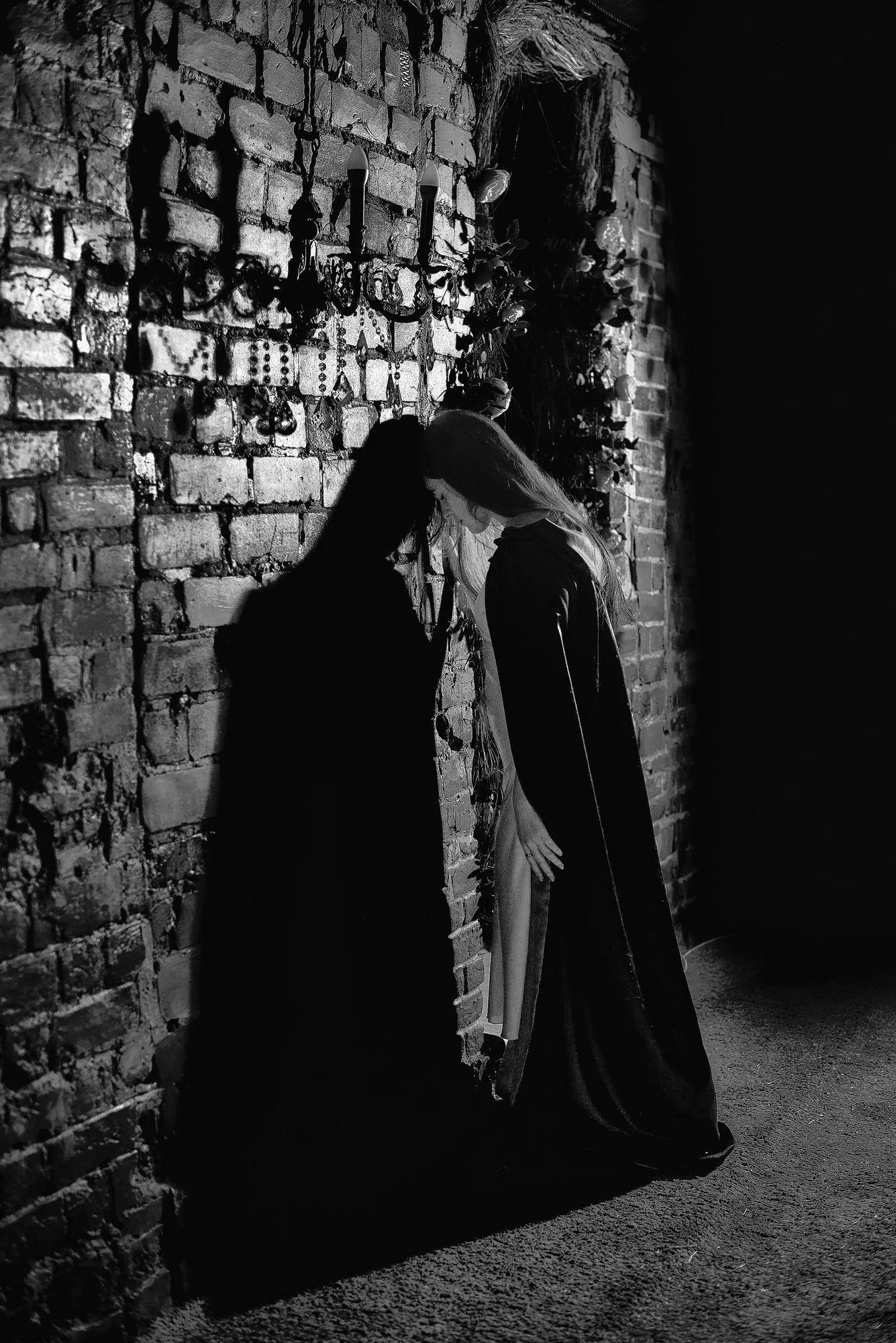 🌙 Бессонница из серии «Кукла колдуна» Это не просто ночь без сна. Это — пространство между мирами: где доверие встречается с обманом, а защита превращается в искушение. Девушка в винтажном свадебном платье и двухстороннем плаще с капюшоном бродит по полумраку заброшенного интерьера, будто ища выход из сна, который уже не кажется сном. Рядом — старый рояль, зеркало, отражающее не только лицо, но и внутреннюю тревогу. Ни дверей, ни голосов — только напряжённое ожидание и тихий поворот от страха к решимости. Эта серия — первая часть триптиха, вдохновлённого мрачной поэзией песни «Кукла колдуна». Здесь ещё нет колдуна — только его тень, его ожидание… и её выбор.