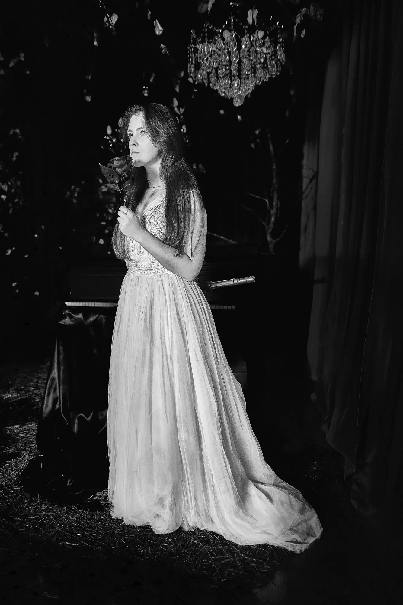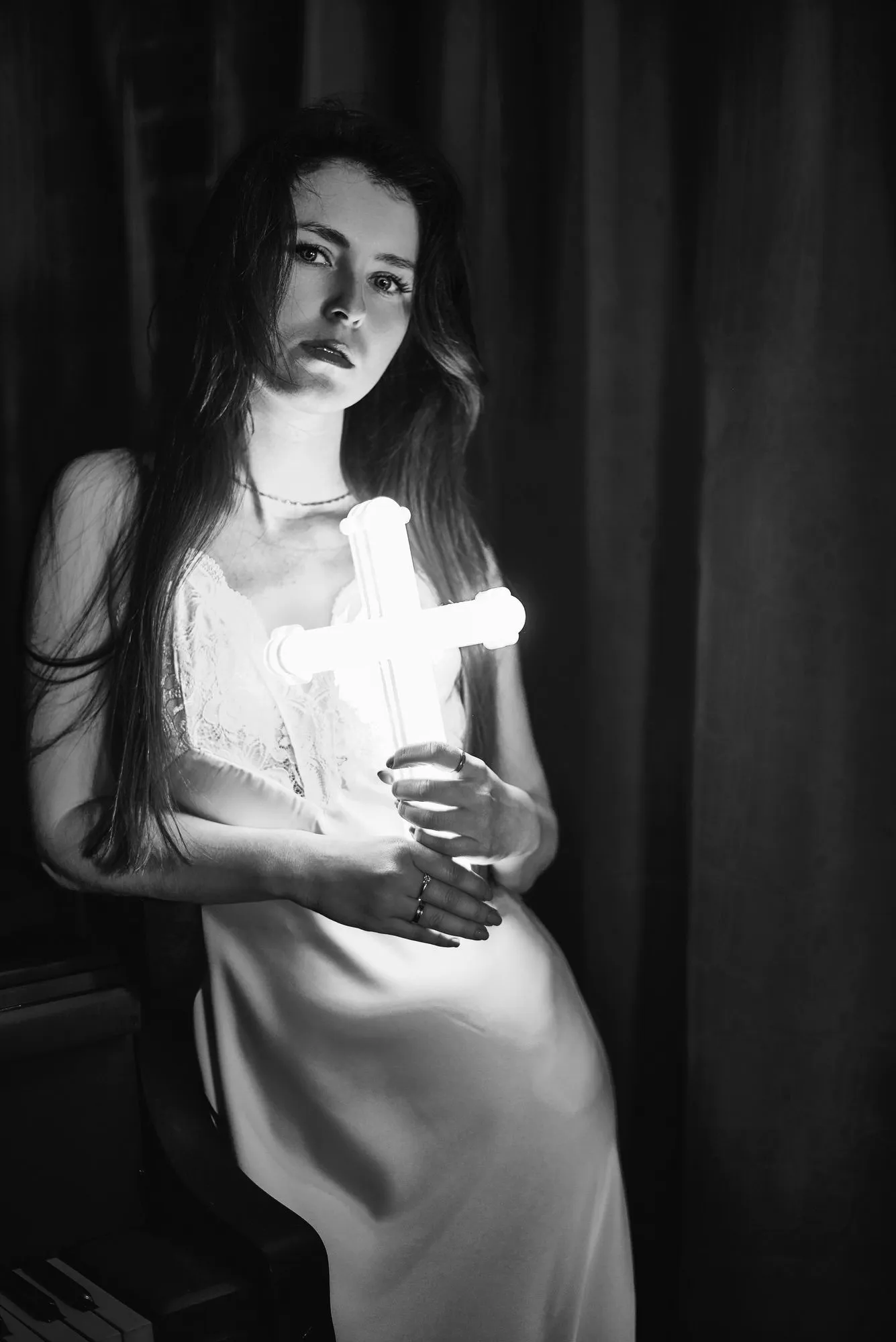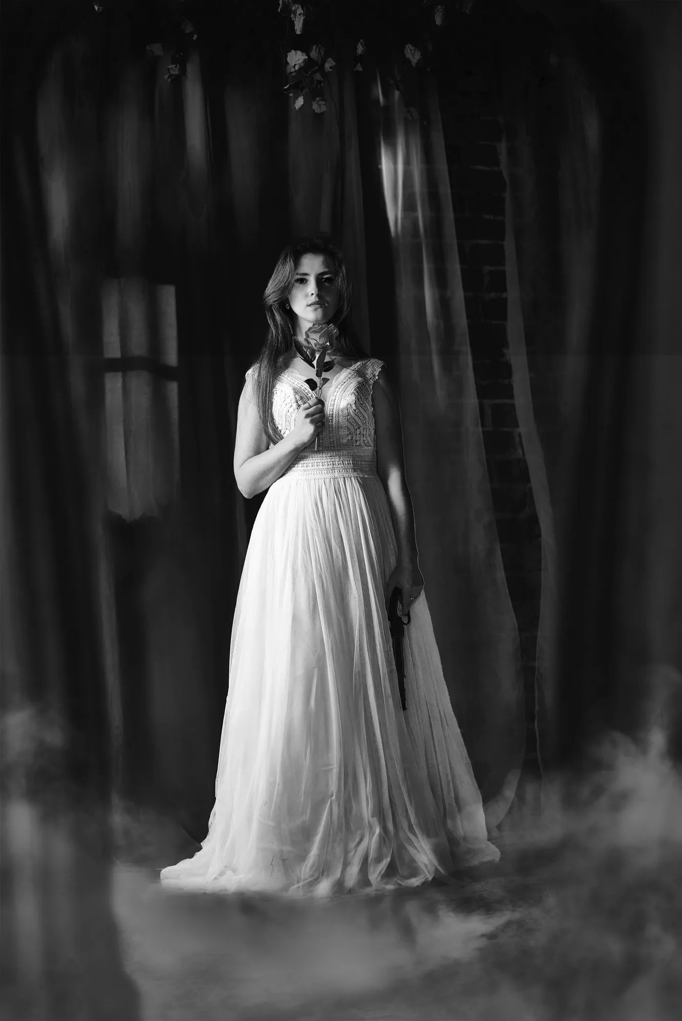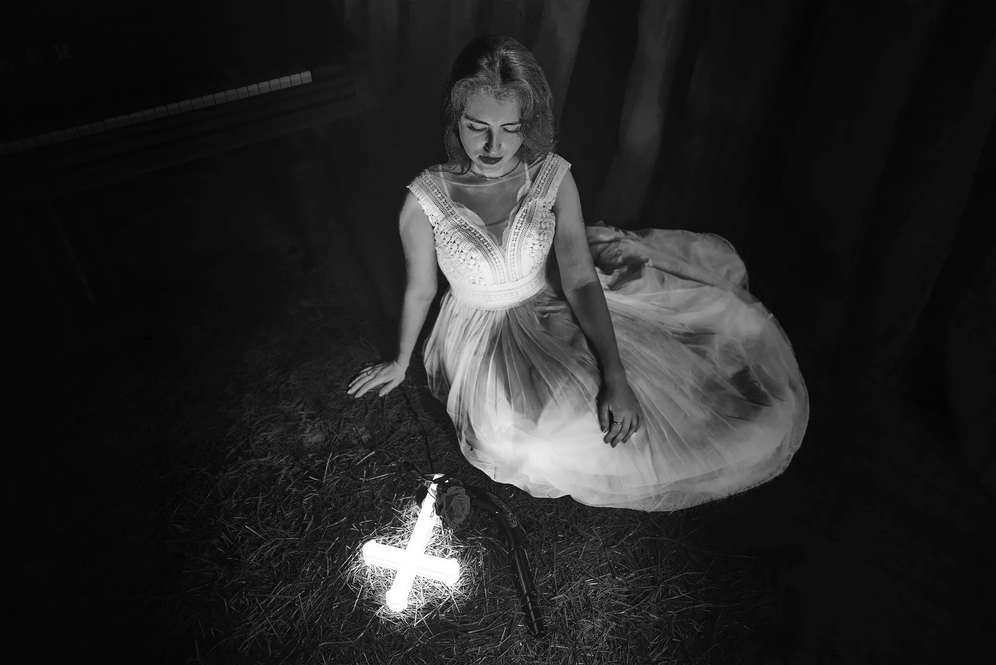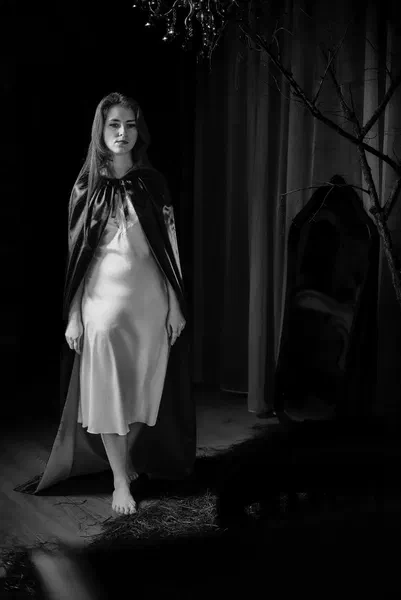 🌙 Бессонница из серии «Кукла колдуна» Это не просто ночь без сна. Это — пространство между мирами: где доверие встречается с обманом, а защита превращается в искушение. Девушка в винтажном свадебном платье и двухстороннем плаще с капюшоном бродит по полумраку заброшенного интерьера, будто ища выход из сна, который уже не кажется сном. Рядом — старый рояль, зеркало, отражающее не только лицо, но и внутреннюю тревогу. Ни дверей, ни голосов — только напряжённое ожидание и тихий поворот от страха к решимости. Эта серия — первая часть триптиха, вдохновлённого мрачной поэзией песни «Кукла колдуна». Здесь ещё нет колдуна — только его тень, его ожидание… и её выбор.